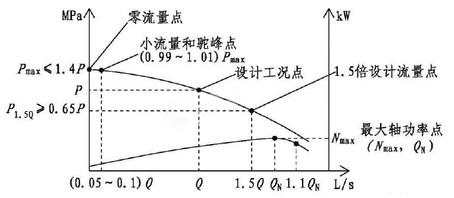 2. 消防水泵的流量揚程性能曲線應(yīng)為無駝峰、無拐點的光滑曲線, 當消防水泵出流量為設(shè)計流量的5% - 10% 時, 其出口壓力與零流量時壓力的增加值不應(yīng)超過消防水泵零流量時出口壓力值的1%;