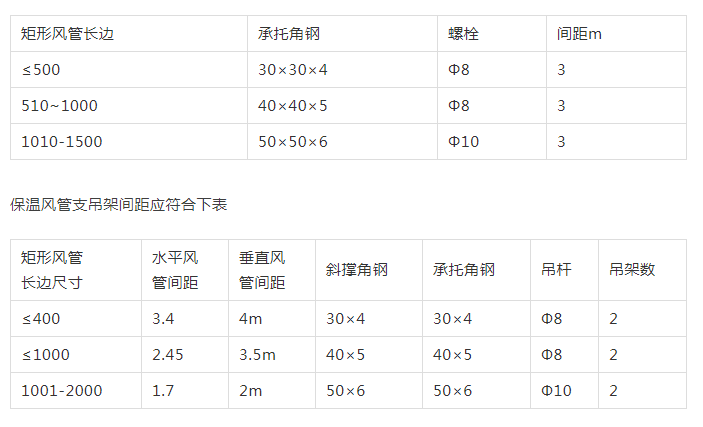 風(fēng)管支吊架間距(不保溫風(fēng)管)應(yīng)符合下表: