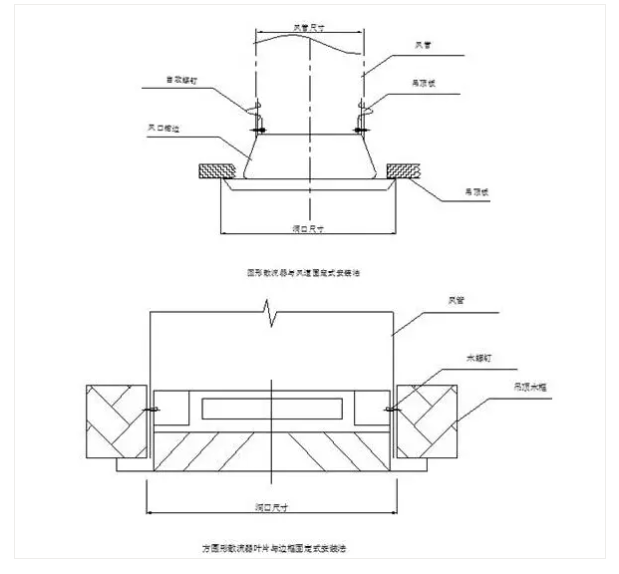 20、為增強(qiáng)整體裝飾效果,風(fēng)口及散流器的安裝采用內(nèi)固定法:從風(fēng)口側(cè)面用自攻螺釘將其固定在龍骨架或木框上,必要時(shí)加設(shè)角鋼支框。