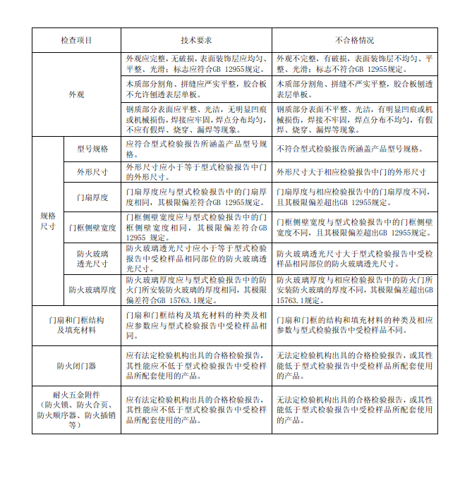2 檢查規(guī)格型號是否與型式檢驗報告中受檢防火門樣品所配套使用的相一致;或對照合格檢驗報告,核對其性能是否低于型式檢驗報告中受檢樣品所配套使用的產品。