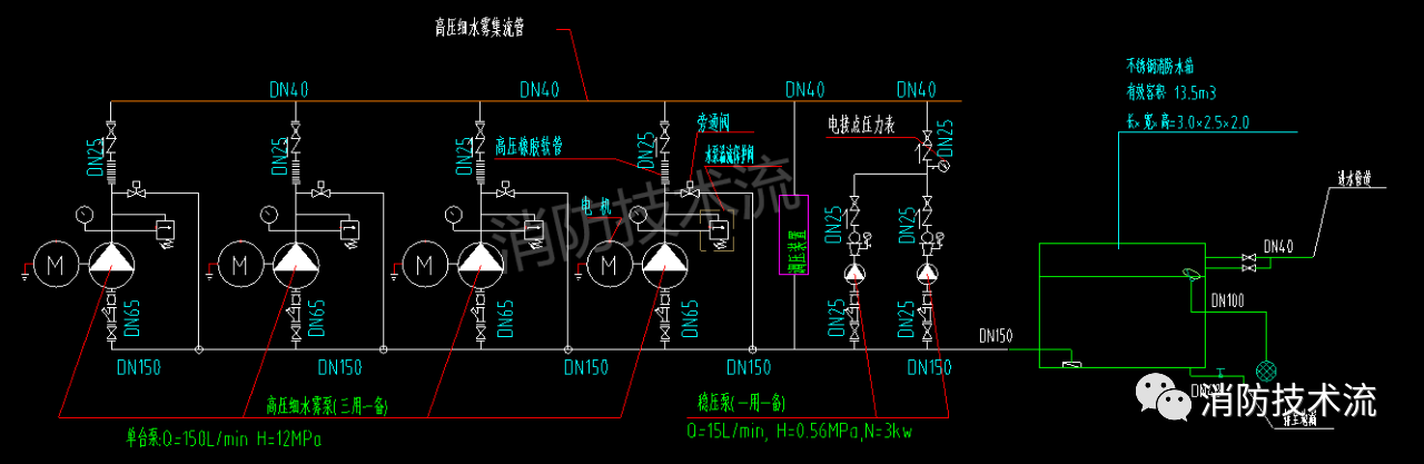 6、細(xì)水霧滅火介質(zhì)采用淡水,系統(tǒng)用水量為1.5t,設(shè)置有效容積為13.5m?儲(chǔ)水箱,水箱材質(zhì)采用不銹鋼,儲(chǔ)水箱的出水口高于水泵的入水口(即水箱出水口對(duì)水泵入水口保持正壓)