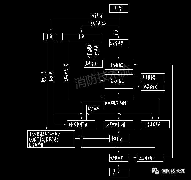 ?。?)手動(dòng)控制:當(dāng)現(xiàn)場(chǎng)人員確認(rèn)火災(zāi)且自動(dòng)控制未動(dòng)作時(shí),可按下分區(qū)控制閥的手動(dòng)啟動(dòng)按鈕,啟動(dòng)系統(tǒng)實(shí)施滅火,火災(zāi)結(jié)束后可通過細(xì)水霧電氣控制箱的按鈕進(jìn)行復(fù)位。
