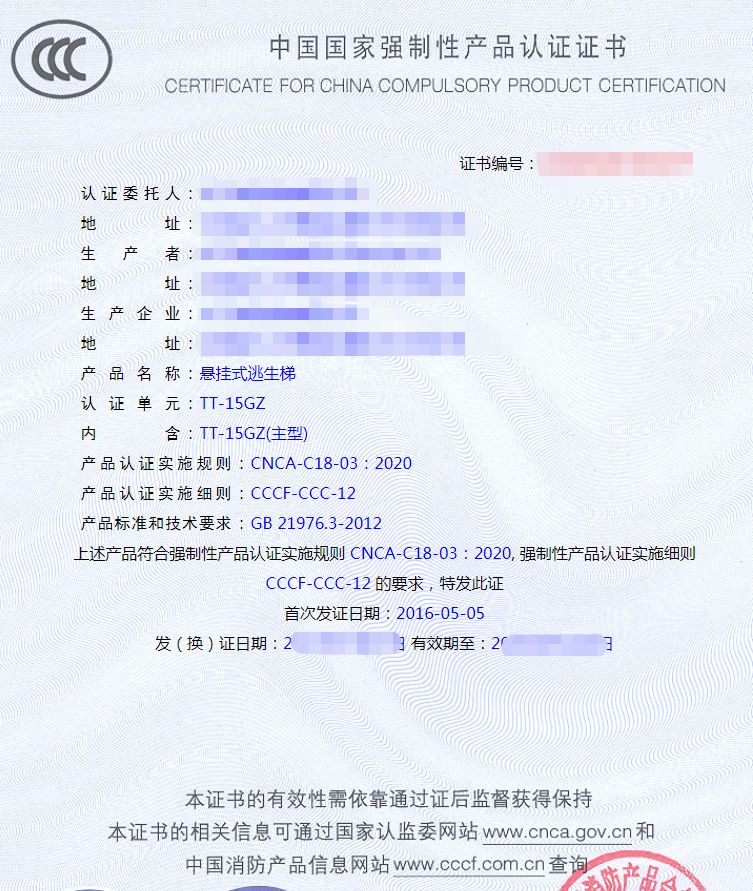 GB 21976.3-2012《建筑火災逃生避難器材 第 3 部分:逃生梯》 《強制性產品認證實施規(guī)則 避難逃生產品》 《強制性產品認證實施細則 避難逃生產品逃生類產品》